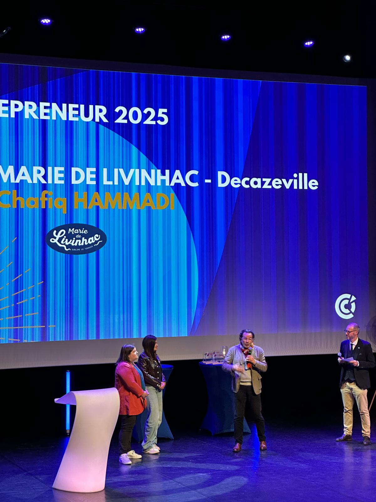 C’est avec une immense fierté que nous annonçons que Marie De Livinhac, sous la direction de Chafiq Hammadi, a remporté le Prix Entrepreneur 2025 lors de l’événement Aveyron des Champions, organisé par la CCI Aveyron. Cette distinction est une reconnaissance exceptionnelle de l’engagement, du travail et de la passion que Chafiq et toute son équipe mettent chaque jour pour faire grandir l'entreprise.
